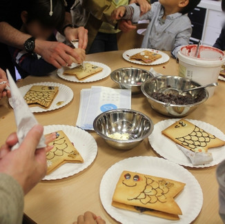 頑張って作った後には、試食会♪ 幼稚部の大きなこいのぼりクッキーをぺろりと食べきる子も。小中学部の子たちは、自分たちの作った和菓子を食べるのは惜しいと言ってる子もいましたが、特別にふるまってもらったどら焼きを頬張って、日本の味を堪能していました。